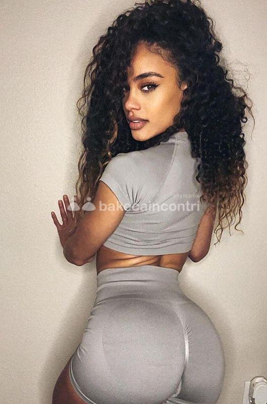 Mulatta chiara (cannella), con gambe slanciate, pancia piatta, sedere piccolo a mandolino, bel viso, seno rifatto (terza scarsa) e capelli riccioli tinti di biondo.